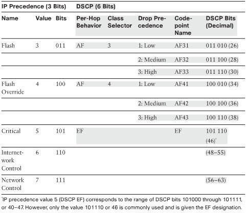 - Class 5 – Expedited Forwarding (EF) – premium service, least likely to be dropped. For time-critical traffic such as voice. DSCP bits cover values from 40-47 but 46 is the only one commonly used with the EF designation.